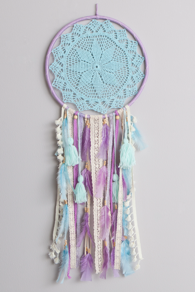 Transforma tu espacio en un oasis de encanto y tranquilidad con nuestro Atrapasueños Grande Menta con Detalles en Lila.