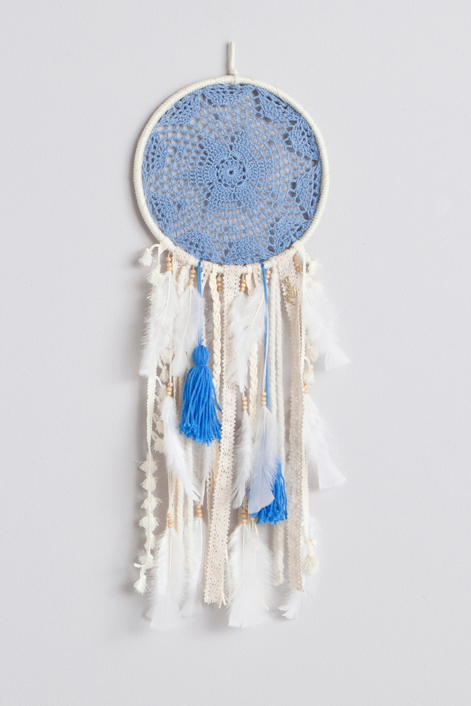 El tono azul, simbolizando el cielo y la calma, crea un ambiente relajante que invita a la serenidad. Cada detalle de nuestro atrapasueños, cuidadosamente tejido a mano, representa la calidad artesanal y la atención dedicada a cada pieza, haciendo que sea más que una decoración, una obra de arte.